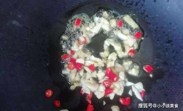 3、起鍋後,鍋內先放食用油。油溫高時,將大蒜和紅辣椒放入鍋中,炒香,將青椒放入鍋中,再將豬血倒入鍋中。快速煎炸兩種成分。
