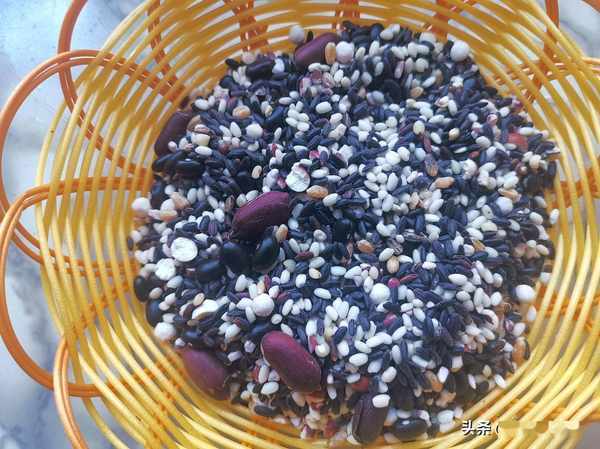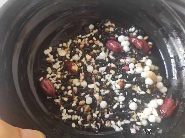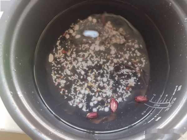 第一步:這款粥是五黑八穀粥,用了五種黑色的糧食,以及各種雜糧,營養特別好。黑米素有"黑珍珠"和"世界米中之王"的美譽。其中含蛋白質、維他命、鈣、磷、鉀、鎂、鐵、鋅等營養元素,具有補腎黑髮、預防貧血等作用。黑花生在我國很多地方都有種植,屬於彩色花生的一種,富含硒元素,顏色偏黑,在蛋白質、鉀元素、鋅元素等方面也比普通花生要高一些,有很豐富的營養,可以補硒、調節血壓、補腎、止血等。還有其他的黑色糧食就不一一介紹了。這樣的營養粥經常吃對於身體很有好處,可以烏髮,强健身體,精神滿滿的。