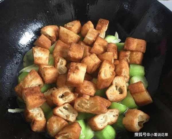 4、絲瓜炒到斷瞭之後,把油條放進去,加鹽加雞精,炒到配料入味,就可以裝盤瞭。