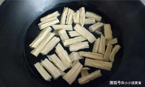 2.將清水倒入容器中。煮沸後加入處理好的腐竹和香菇,用水焯2-3分鐘,撈出後立即用冷水沖洗幹凈。蘑菇在鍋裡煮的時間不要太長,否則會失去蘑菇的酥脆口感。