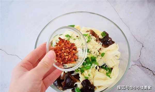 3、幹腐竹和香菇放涼後瀝幹水分,放入事先準備好的碗中,加入蒜末、蔥花、煮熟的白芝麻和辣椒醬。鍋中倒入少許食用油。油熱後,加入花椒10粒,炒香,撈出花椒,趁油熱淋在腐竹和香菇上。