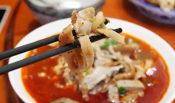 肺洗凈後灌入面漿,煮熟後變得雪白豐腴,切開成條就變成瞭西北著名的面肺子。面肺子和其他各種雜碎煮熟之後,配上羊肉、羊骨熬成的好湯,加上秘制的調味料,倒入放瞭蔥花、薑、蒜末的大碗裡,再加上特制的油辣子,不膻不腥不膩,色香味俱全。