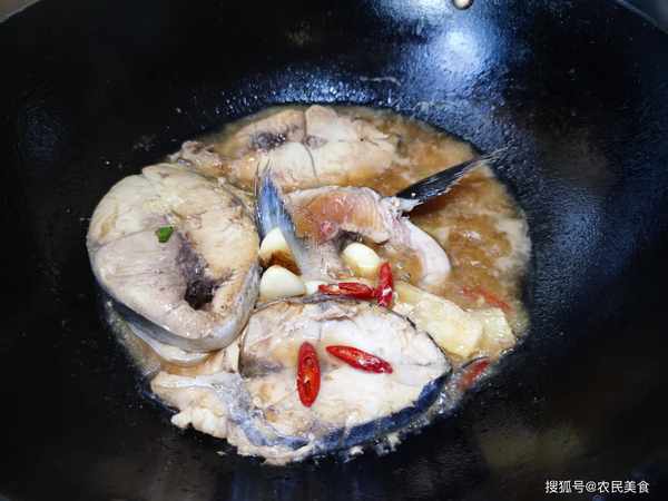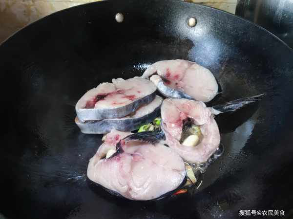 2.鍋中入油爆香蔥薑蒜、幹辣椒和一瓣八角,然後把鮁魚擠幹水分入鍋,利用鍋中的鍋汽兩面略煎。