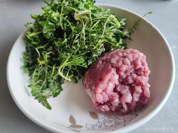 1.采挖回來的薺菜摘洗幹凈,然後放入清水中浸泡二個小時左右,把薺菜中的雜質浸泡幹凈後撈出,豬五花肉斬剁成餡。
