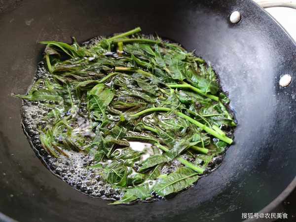3.鍋中入油爆香蔥薑蒜,下入攥幹水分的薺菜翻炒均勻,烹入料酒後加入少許花椒面炒香後添湯。