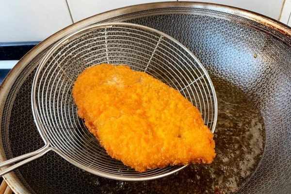 6、炸好之後先將雞排撈出來,需要簡單的控油。因為後面還需要復炸一次,這樣才能炸的更熟,不能隻是外面炸熟瞭,裡面也必須要完全地炸熟。