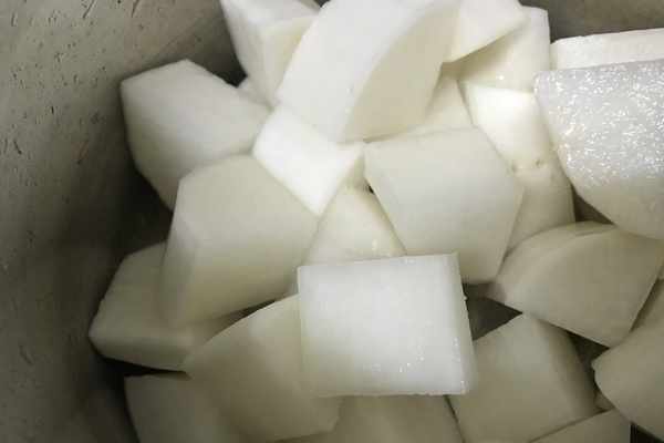 3、蘿卜也同樣清洗幹凈,去掉外皮之後,切成小塊備用。
