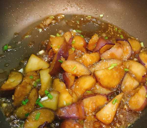 4、鍋裡倒入少量油,倒入茄子快速翻炒半分鐘,茄子變軟後倒入小碗裡的料汁,翻炒均勻後蓋上蓋子,用小火燜2分鐘。