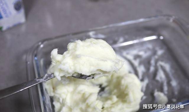 5、用勺子將酸奶、少許鹽、山藥泥攪拌均勻,攪拌至軟如冰淇淋融化或精制油狀;酸奶是甜的,可以加糖調味;加少許鹽更好地帶出甜味;