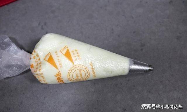 6、將紗膏放入袋中,提前將大的多齒花放入袋中;如果沒有裱花袋和花尖,可以用曲奇刀或勺子挖空,放在盤子裡敲打成型;