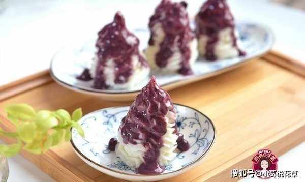 8.用勺子將藍莓醬倒在山藥泥上。