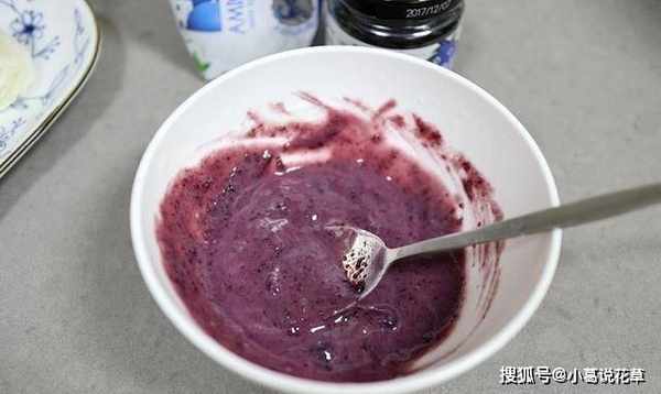 7、在藍莓醬中加入適量白酸奶調成液體糊狀;