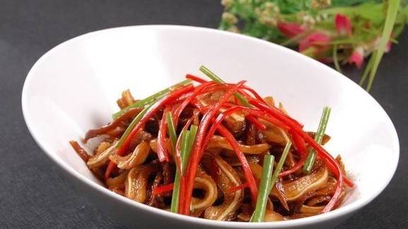 食材:豬耳朵300g、香油適量、生抽適量、蒜末適量、彩椒適量、白糖適量、黃瓜絲適量、鮑魚汁適量、陳醋適量