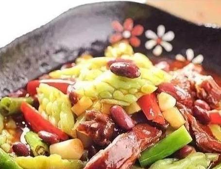 2、凈鍋裡放油,先下薑片、大蒜和甜面醬炒香,待倒入鴨塊炒勻以後,摻適量鮮湯並加鹽、十三香、醬油、味精和雞精,燒至鴨塊軟熟才下入苦瓜塊、青紅美人椒和紅腰豆,同燒10分鐘,即可起鍋裝盤。