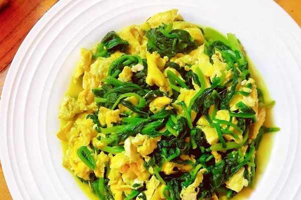 3.鍋中下油10克,大火燒熱,用蔥薑蒜爆炒;加入菠菜,放鹽、雞粉、胡椒粉;放入炒好的雞蛋,大火翻炒幾下,淋香油出鍋。