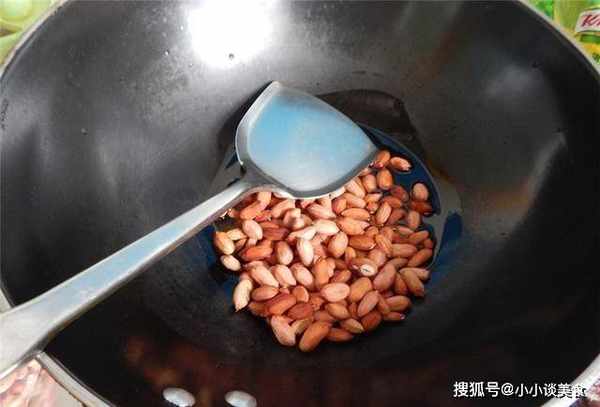 2、大蒜去皮後,用刀壓扁,切成蒜末備用。起鍋,倒入適量油,冷油熱鍋,放入準備好的花生米,小火翻炒至聽到噼裡啪啦的聲音,花生米稍微變色,撈出放涼備用以後使用。顏色不能太深,否則關火放涼後花生米會變得有點糊狀。