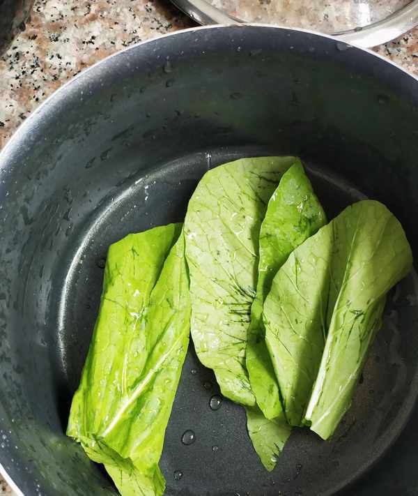 把浸泡好的小白菜葉放到鍋裡煮熟