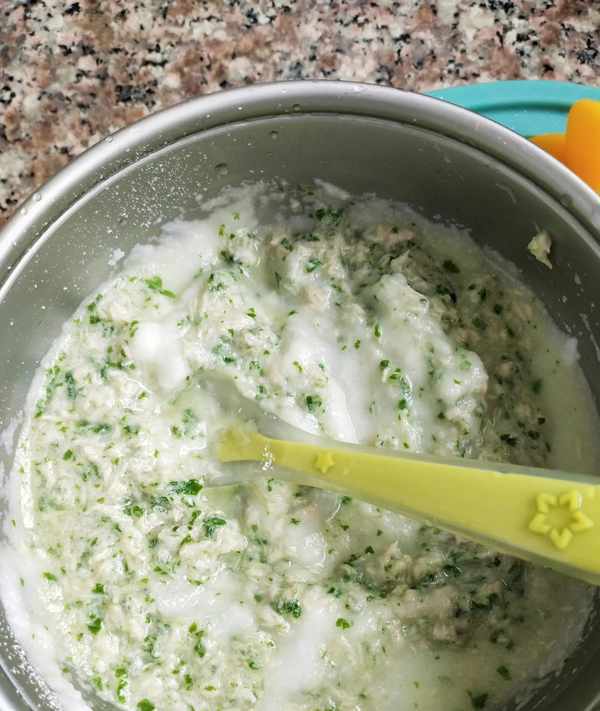 撈起菜葉,取出煮熟的豬肉片,一起放入輔食機攪碎,記得加點溫水哦
