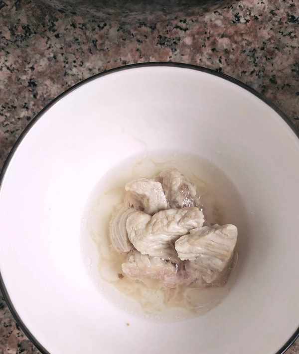 把豬瘦肉切薄片,4到5片,放入鍋中蒸熟,這裡提醒大傢哦,可以把豬肉放入水中浸泡去腥