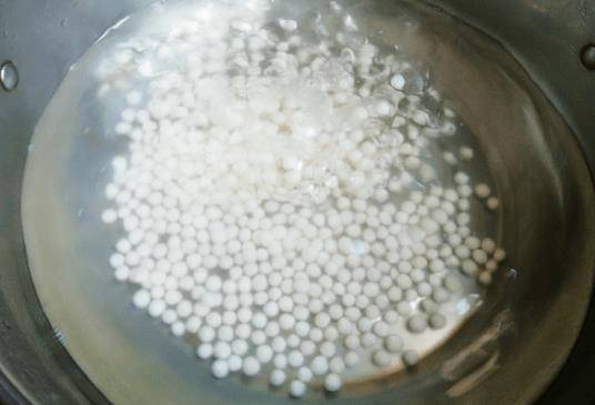 然後鍋裡倒入半鍋水,先用大火把水燒開,然後把西米倒入鍋裡,轉小火煮半個小時左右。中間用勺子不斷攪拌西米,防止粘鍋。煮沸後,關火,蓋上鍋蓋,讓西米燉約5分鐘。當西米變得透明時,將其倒出並再次過冷水。