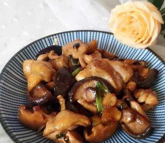 3、雞塊熟時放香菇,繼續翻炒;最後放鹽,收汁翻炒均勻即可出鍋。