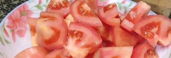 2.處理西紅柿,把西紅柿對半切開,然後去掉根蒂之後,切成滾刀塊即可裝盤備用;