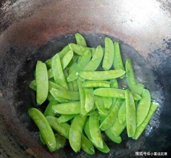 4.將材料快速炒出香味,然後將荷蘭豆倒入鍋中翻炒約2分鐘。等食材快要散開的時候,在鍋裡加入鹽和雞精。將配料炸好後,您可以將其鍍金。