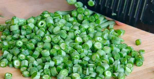 1.首先準備豇豆角一小把,將其放在清水中清洗幹凈。然後去掉它的頂端,用刀切成小丁放入碗中備用。