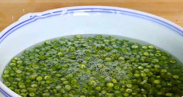 2.往豆角裡面加入2克食用堿,再加入適量的清水沒過豆角,往豆角裡面加入食用堿,這樣烹飪過後就會更軟嫩一些啦。放置一旁浸泡10分鐘備用。