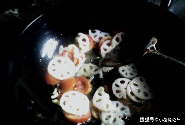 第三步:所有的材料都處理好後,就可以開始下鍋瞭。首先,將鍋用大火加熱並加入少量油,然後將油加熱至70-80%的熱量,然後將切好的西紅柿放入鍋中。待軟爛時,將切好的藕片放入鍋中一起炒。蓮藕片可以完全吸收番茄湯!