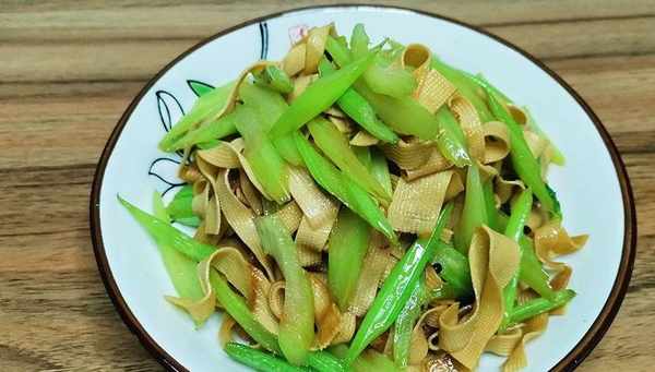 5、下入豆皮,同時淋入生抽,加入蠔油,將芹菜和豆皮翻炒均勻,並且入味,然後根據咸淡再調入適量的食鹽即可。