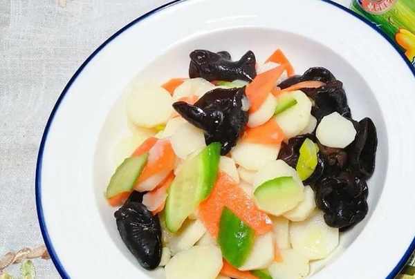 3、鍋內燒開水,放入山藥,煮2分鐘左右後,山藥斷生,撈出。然後下入胡蘿卜和木耳,繼續煮1-2分鐘,然後撈出。