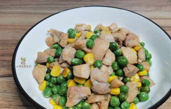 4、鍋內的底油中,下入蒜末炒香,放入豌豆粒和玉米粒,烹入1勺生抽,翻炒均勻,然後下入雞肉再次一起炒,加入適量的食鹽,炒至入味即可關火。