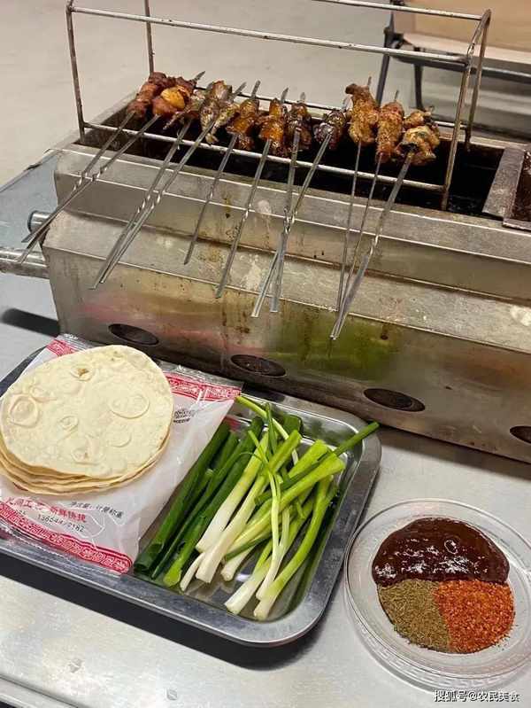 常海感覺淄博的燒烤要說特色也就是小餅卷肉串,把小餅先折疊起來蘸上辣醬和幹料,然後把烤熟的串在小餅上一擼,再夾上一根小蔥,最好在小爐子上把餅熱一下,這樣這半發面的餅表皮酥酥的吃起來才過癮。