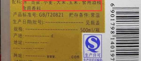因為白酒市場有嚴格的監管,所以白酒必須在包裝上寫上所使用的原料,酒精勾兌酒使用的食用酒精自然也就無所遁形瞭。