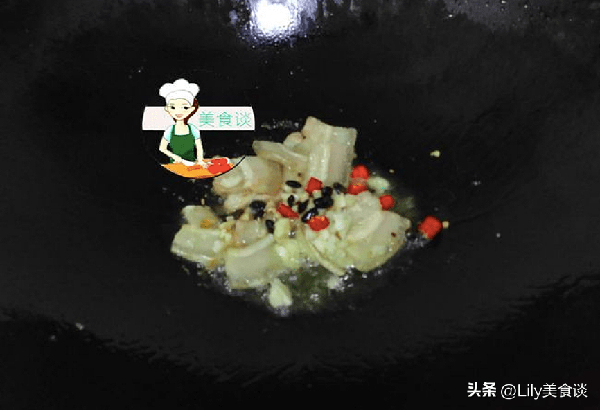4、五花肉炒至焦黃的狀態,下入蒜蓉、豆豉和小米辣一起炒香。