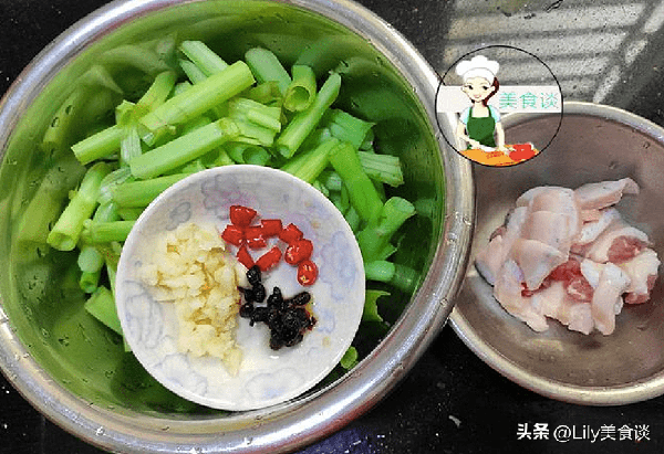 食材:空心菜梗(通菜)、五花肉、豆豉、大蒜、小米辣。