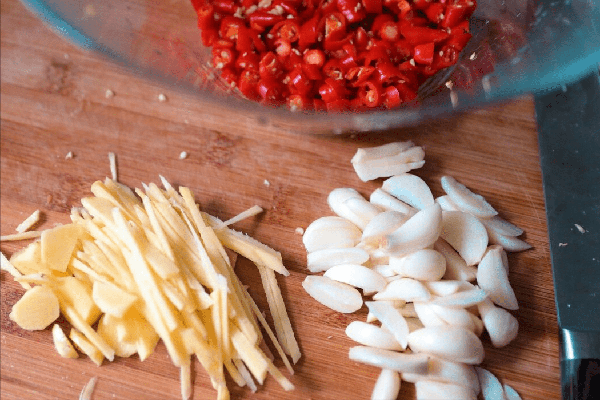 4、之後,將大蒜、生薑、小米辣洗凈後,分別切片、切絲、切圈,切好後倒在白蘿卜裡,戴上手套抓拌均勻,直至與調料完全融合之後,上面蓋上蓋子,放冰箱冷藏,醃制1個晚上的時間,就能吃瞭。