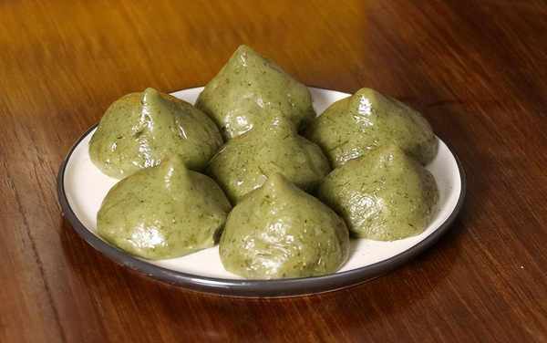 6、 鍋中燒水,水開將蒿團放在上面蒸熟。