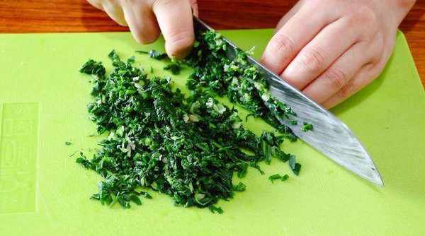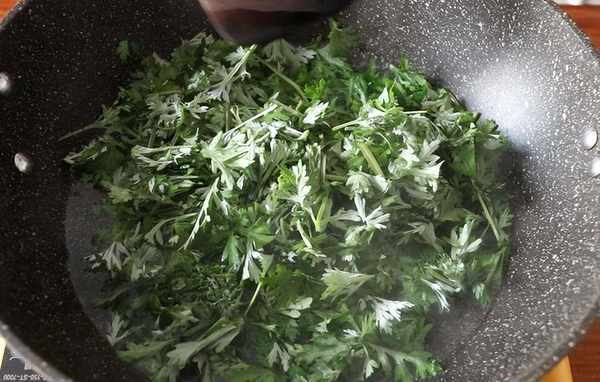 3、 蒿清洗幹凈,鍋中加入適量的水,將蒿放入進去燙至變軟,然後撈出擠幹水分,切成碎末;