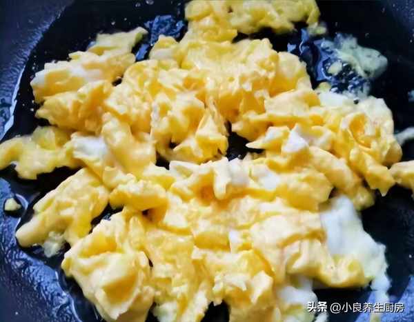 第四步:鍋中調入一些橄欖油,油要多放一些,滑入一些雞蛋液,讓雞蛋液煎至成型,迅速用鍋鏟翻散,裝在容器備用。