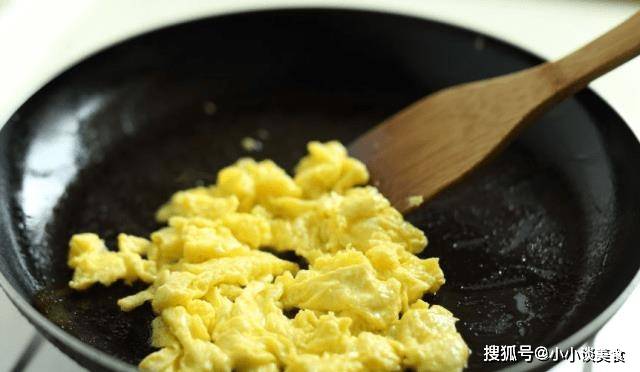 準備一個幹凈的碗,把雞蛋倒進去,然後把雞蛋打勻,然後把油倒進鍋裡,油熱7分鐘後,把雞蛋倒進鍋裡,快速煎成蓬松的蛋塊,取出出儲備。