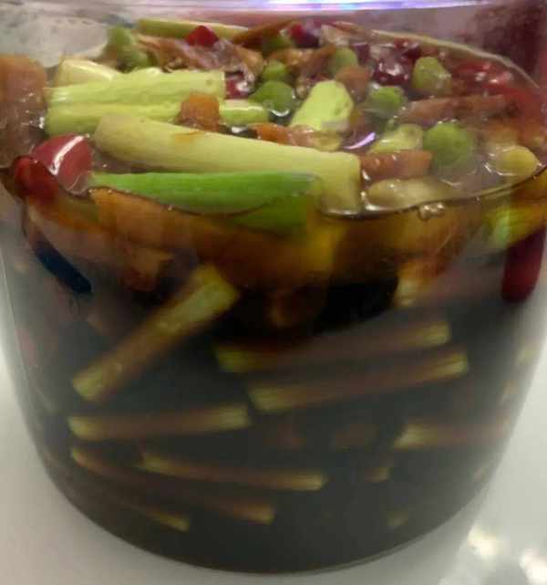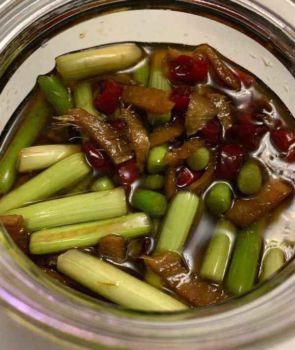 第六步,把蒜苔和湯汁都裝入密封罐中,放入冰箱冷藏一晚,即可食用!