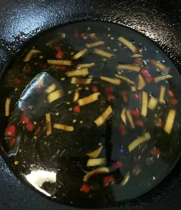 第四步,鍋中加入少許油,燒到五成熱時,放入八角花椒炒香,然後撈出。加入準備好的小米辣和薑絲,炒出香味,倒入生抽,香醋,冰糖,熬制湯汁煮開,再加少許鹽,關火。