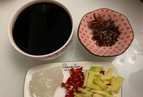 第三步,準備好200克生抽,200克香醋,冰糖25克,八角,花椒,小米辣,生薑切絲,食用油少許。