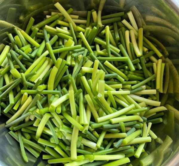 第一步,把蒜苔掐頭去尾洗幹凈,然後控水,切成段。