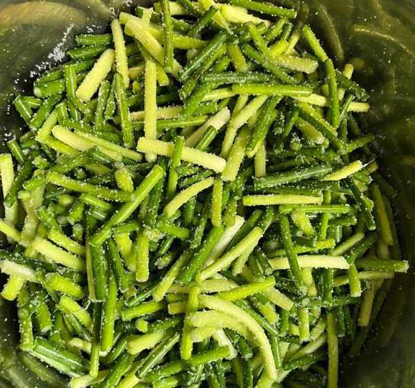 第二步,往蒜苔上面撒少許食鹽,攪拌均勻,醃制半天。