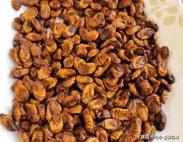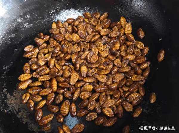 3、鍋熱後,鍋中倒入食用油,燒熱,放入蠶蛹,炸至金黃色,放入適量藥明,炒出香味。