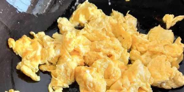 2、雞蛋打入碗內加少許鹽,攪拌均勻炒成塊。