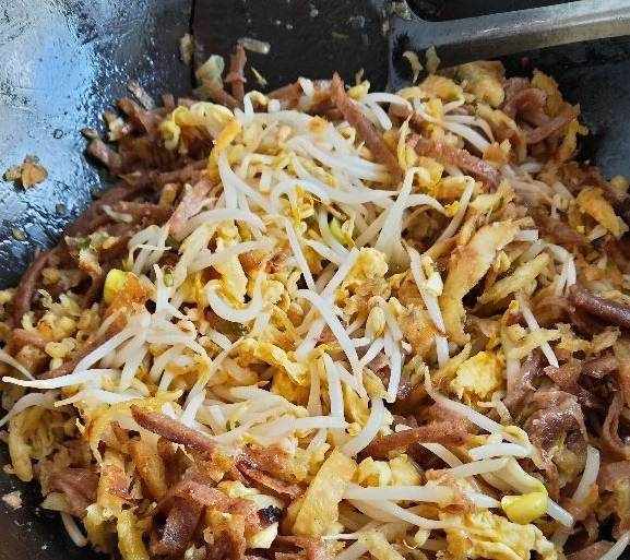 3、鍋底加油,油熱時放入蔥花烹出香味時,放入花椒烹出味撈出,放蔥花炒出香氣放入綠豆芽稍微炒一下,加入少許生抽、鹽攪拌均勻,放入餅絲、雞蛋翻炒,小火改成煸炒,五分鐘後淋上香油出鍋即可。